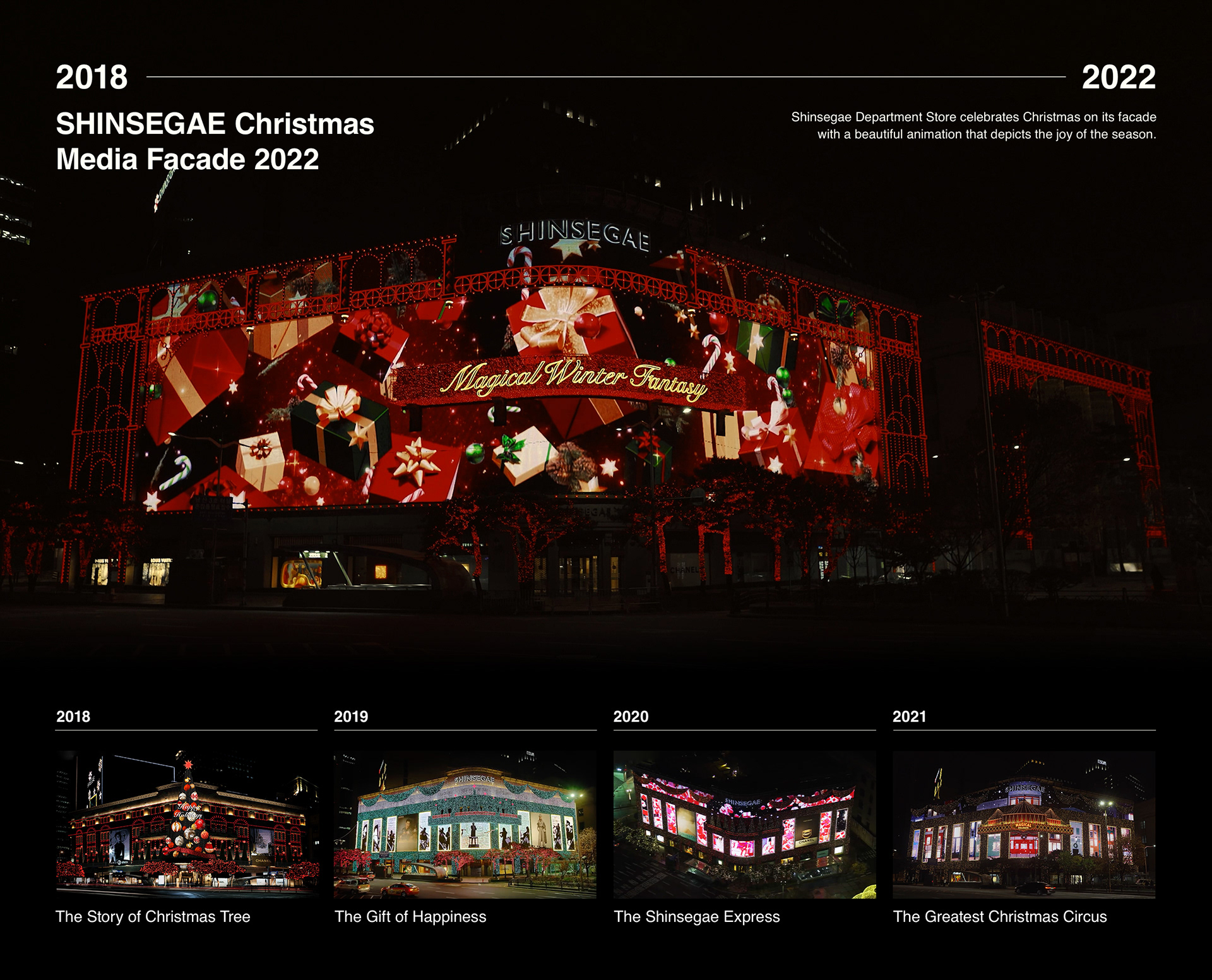 2022년 신세계백화점 미디어 파사드는 디자인스튜디오4월이 참여한 마지막 프로젝트로, 모션그래픽 전문 회사 SUPER VERY MORE와 협업하여 진행되었습니다. ‘CHRISTMAS MARVEL’ 이라는 주제로 마법사들이 즐기는 크리스마스를 초현실적인 분위기로 표현하였으며, 마법사의 책장에서 시작해 몽환적인 설경과 화려한 크리스마스 파티로 이어지는 각 시퀀스마다 디테일하고 화려한 비주얼이 돋보였습니다. 디자인스튜디오4월은 스토리보드와 비주얼 컨셉아트를 진행하였습니다.
