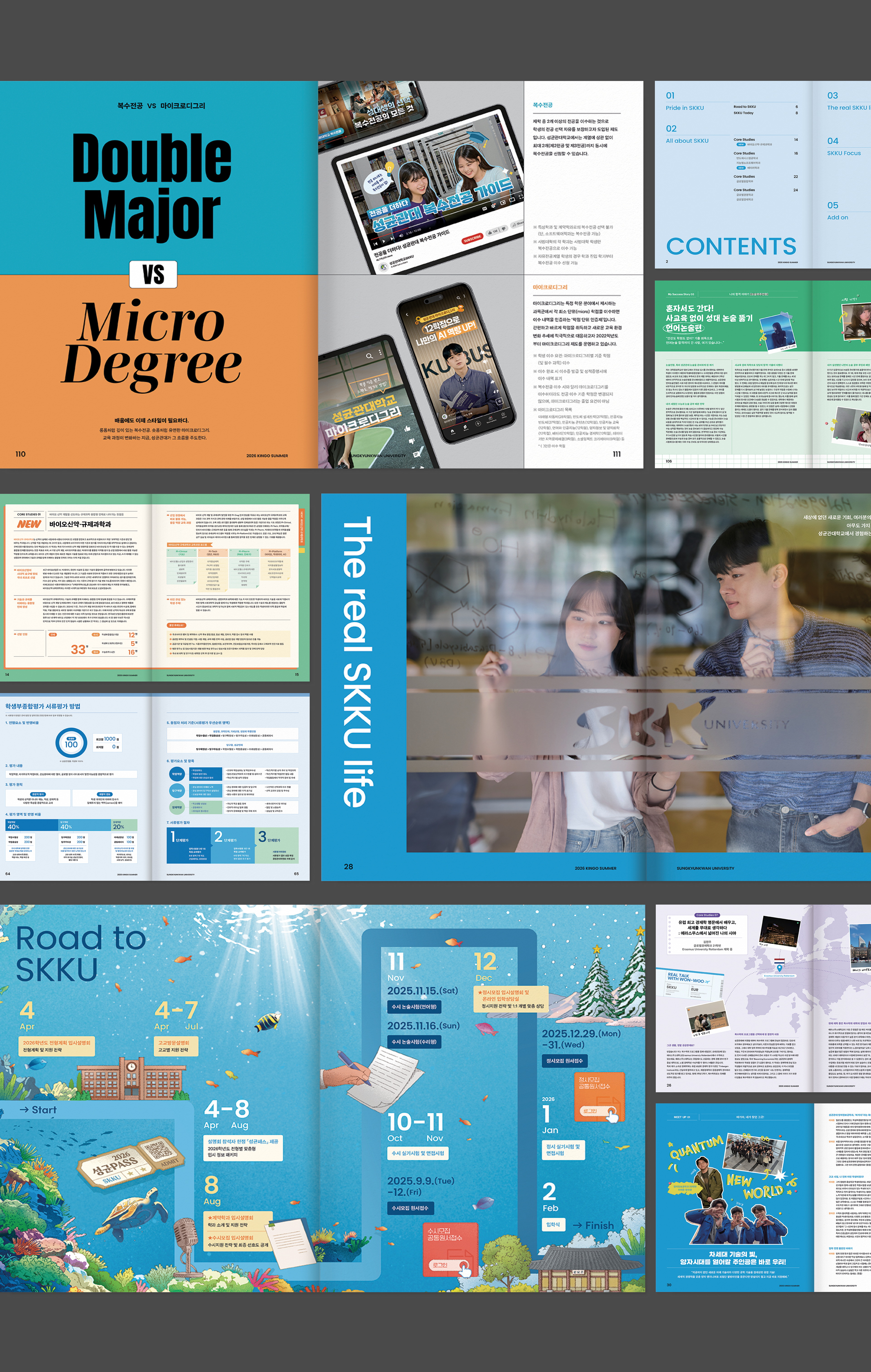 allowing readers to experience a sense of global vision as if embarking on a journey. In addition, the section on “double majors” was designed in contrast with “Micro Degree,” visually highlighting the diversity of academic choices and career pathways available. Overall, the layout is structured with a modern sans-serif typeface and clear grid system to ensure readability and precision. A cool blue palette, accented with bright seasonal tones, was applied to reflect the energy of summer and to visually emphasize vitality. The final design conveys both trust and positivity, leaving a confident and welcoming impression on prospective students.